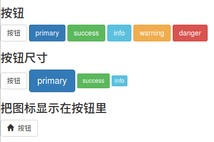 <h3>按钮</h3> <button type="button" class="btn btn-default">按钮</button> <button type="button" class="btn btn-primary">primary</button> <button type="button" class="btn btn-success">success</button> <button type="button" class="btn btn-info">info</button> <button type="button" class="btn btn-warning">warning</button> <button type="button" class="btn btn-danger">danger</button> <h3>按钮尺寸</h3> <button type="button" class="btn btn-default">按钮</button> <button type="button" class="btn btn-primary btn-lg">primary</button> <button type="button" class="btn btn-success btn-sm">success</button> <button type="button" class="btn btn-info btn-xs">info</button> <h3>把图标显示在按钮里</h3> <button type="button" class="btn btn-default"><span class="glyphicon glyphicon-home"></span> 按钮</button>