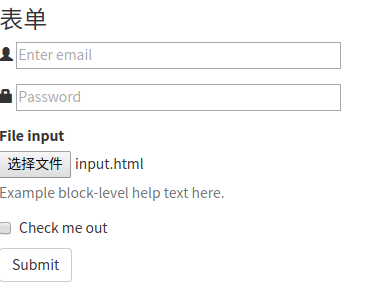 <h3>输入框</h3> <div class="input-group"> <span class="glyphicon glyphicon-user"></span> <input type="text" placeholder="username"> </div> <div class="input-group"> <span class="glyphicon glyphicon-lock"></span> <input type="password" placeholder="password"> </div>
