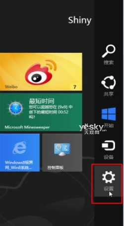 首先我们需要进入Win8系统设置界面。触控用户可以用手指从屏幕右侧往左边划动,或者将鼠标移动到屏幕的右上角或者右下角,调出超级按钮菜单条(Charm菜单条),然后选择“设置”按钮,键盘操作则是直接按“Win+i”键,最后选择“更改电脑设置”。