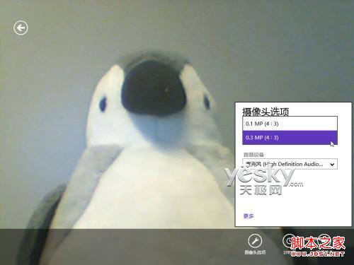 此时Win8屏幕上会出现摄像头拍摄到的情景,底部有三个操控按钮,分别“摄像头选项”、“计时器”以及“视频模式。