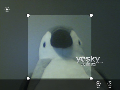 如果我们没有点选“视频模式”,则Win8会完成静态照片拍摄。拍摄完成之后,可以进行剪裁。设置好剪裁范围之后,按右下角的“确定”就可以了,如果不满意可以按“重拍”按钮重新拍摄。