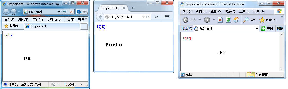 然而,IE6并不能识别style属性中的!important符号,所以导致还是按原来的样式优先级,把“呵呵”两字搞成了红色。
