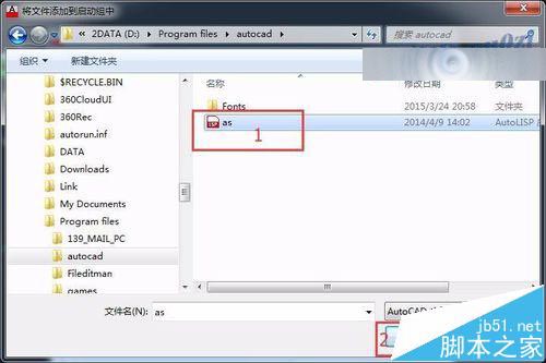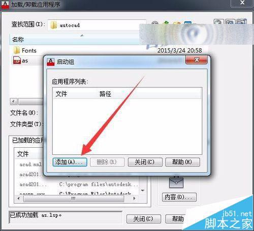 5、通过 添加,找到D盘 Program files\autocad 目录中 as.lsp应用程序 并打开.