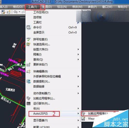 2、运行AutoCAD2013,并打开1份工程施工图纸,在图纸打开后,点击上方菜单栏中的 工具,在菜单中依次打开 AutoLISP- 加载应用程序.