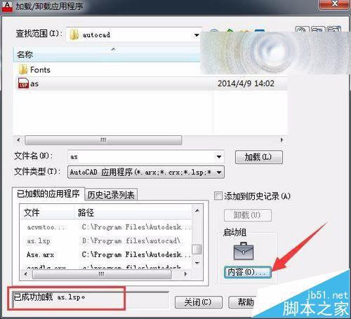 3、找到存放在D盘 Program files\autocad 目录中 as.lsp应用程序,并点击 加载,