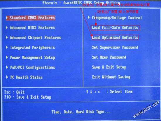 进入到bios设置主界面后,在窗口上的右边,有两个选项,分别是【load fail-safe defaults】是载入保守的设置,也就是系统性能最小,当然也最稳定的配置。和【load optimized defaults】是读取最佳缺省设置。一般情况下设置为保守设置即可。选择【load fail-safe defaults】即可。如下图所示: