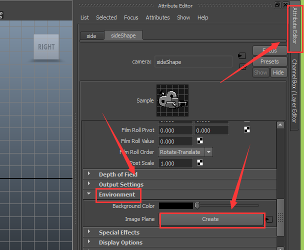 5、点击side摄像机,在属性里找到create选项,如图所示: