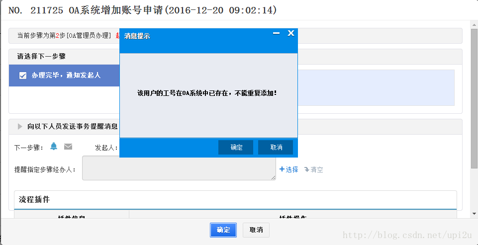 通过流程审批完毕后,流转到OA管理员哪里,管理员在进行下一步转交时即在后台创建账号,如果没有错误则会提示创建成功,如果有错误也会进行提示。