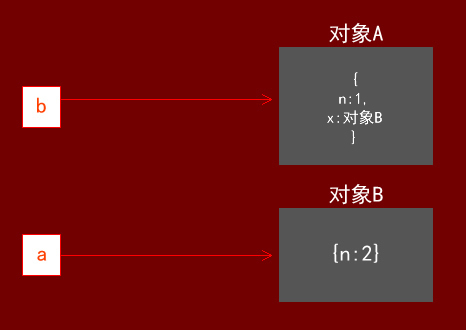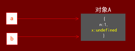 在这里a指向了一个对象{n:1}(我们姑且称它为对象A),b指向了a所指向的对象,也就是说,在这时候a和b都是指向对象A的: