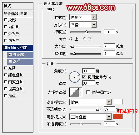 6、选择菜单:图层 > 图层样式 > 斜面和浮雕,设置好后再设置等高线,参数设置如图8,9,效果如图10。