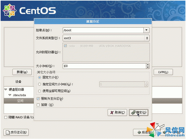 我们继续按下“新建”来建立/boot这个分区。依序填入正确的信息,包括挂载点、文件系统类型、大小等。务必让该分区在整个硬盘的最前面部分。因此,我们针对/boot就选择“强制为主分区”。如下图所示: