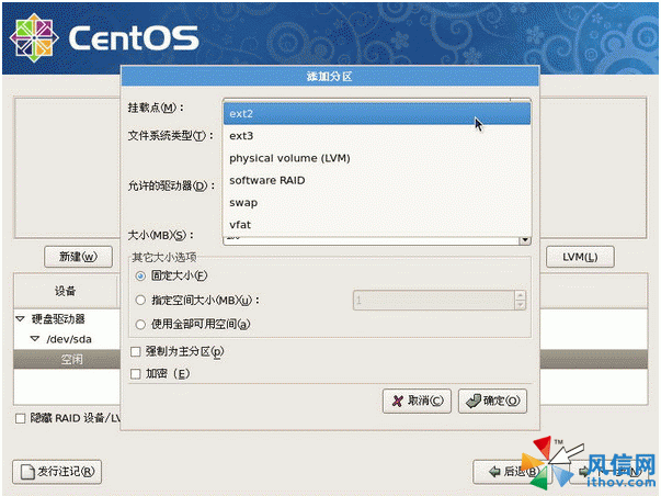 接下来建立根目录(/)的分区。按下“新建”后,就会出现如下的画面。由于我们需要的根目录是使用Linux的文件系统,因此预设就是ext3这个文件系统。 至于在挂载点的地方,你可以手动输入也可以用鼠标来挑选。 最后在大小(MB)的地方输入你所需要的磁盘容量即可。不过由于作者这个系统当中只有一颗硬盘,所以在“允许的驱动器”里面就不能够自由挑选。