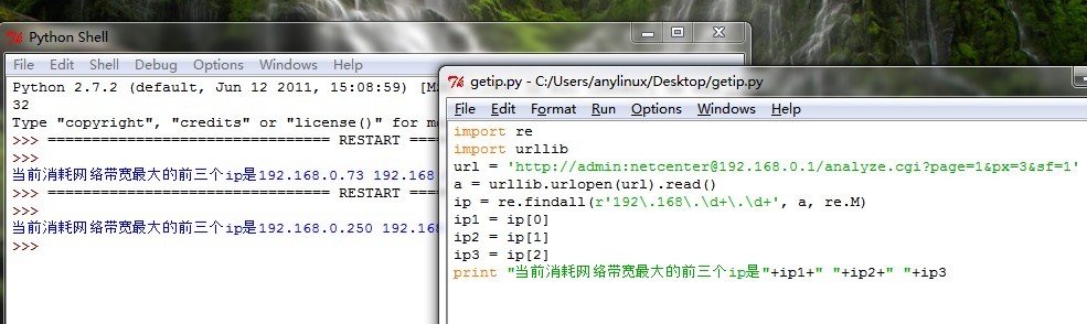 import re import urllib url = 'http://admin:netcenter@192.168.0.1/analyze.cgi?page=1&px=3&sf=1' a = urllib.urlopen(url).read() ip = re.findall(r'192\.168\.\d+\.\d+', a, re.M) ip1 = ip[0] ip2 = ip[1] ip3 = ip[2] print "当前消耗网络带宽最大的前三个ip是"+ip1+" "+ip2+" "+ip3