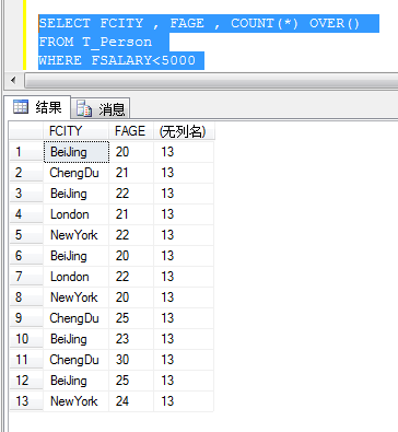 SELECT FCITY , FAGE , COUNT(*) OVER() FROM T_Person WHERE FSALARY<5000