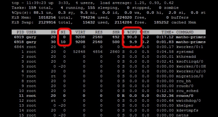 下面来看一个例子,我们同时运行两个 matho-primes 进程,一个使用nice命令来启动运行,而另一个正常启动运行: