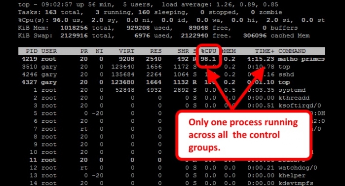 那么,现在我们就启动第二个 matho-primes 进程,这一次我们在 lesscpulimited 控制组中来启动它: