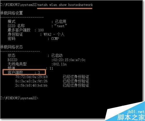 3、找到查看连接数的命令为netsh wlan show hostednetwork执行命令后,可以查看到电脑的Wifi热点连接的客户端数和Mac地址。
