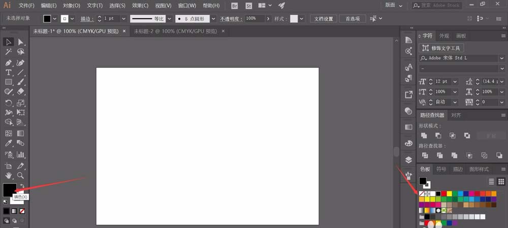 3、随后,我们开始进行基本图形的绘制,在开始绘制前,我们需要进行颜色的设置,在Adobe Illustrator左侧工具栏的下方点击前置色,在色板中选择合适的颜色即可。