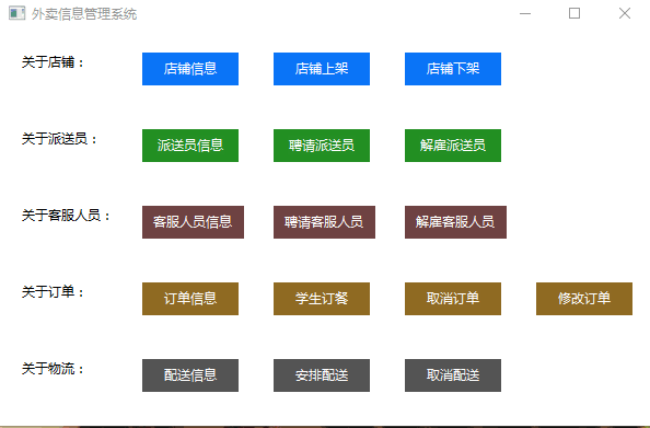以外卖信息系统管理员身份登陆该系统,实现对店铺信息、派送员信息、客服人员信息、订单信息、配送信息等进行有条件查询以及信息的录入、修改、删除等功能。