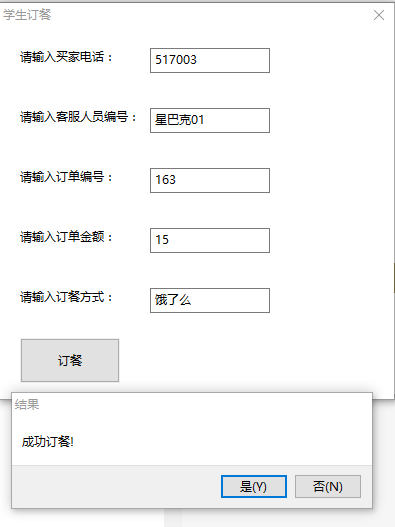 dial = wx.MessageDialog(None, '成功订餐!', '结果', wx.YES_NO) # 创建一个带按钮的对话框, 语法是(self, 内容, 标题, ID)