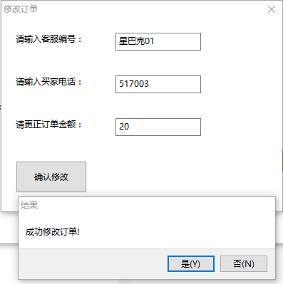 dial = wx.MessageDialog(None, '成功修改订单!', '结果', wx.YES_NO) # 创建一个带按钮的对话框, 语法是(self, 内容, 标题, ID)