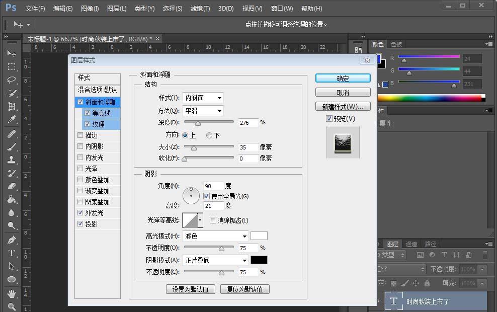 7、给被景添加一蒙版,属性透明调小点,点击文字打上字,给个浮雕,在给个投影。就做好了。