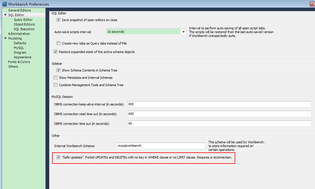 如果使用MySQL Workbench,update语句不加where条件的会执行错误,需要如下图设置取消设置: