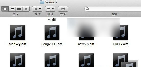 3、将刚才你准备好的.aiff 的音频文件拖拽到这个文件夹当中,选中你希望更改成为的铃音,之后按Mac OS X通知中心提示音修改教程3+D 制作一个副本,将副本文件改名为Basso.aiff 即可