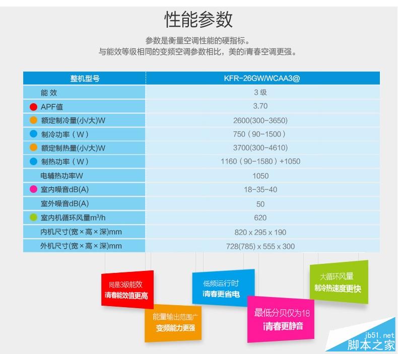 本次我们拿到的是1匹版本,型号为KFR-26GW/WCAA3@,符合国家3级能效半准,额定制冷量为2600W,制冷功率为750W,额定制热量为3700W,制热功率为1160W,电辅热功率为1050W。