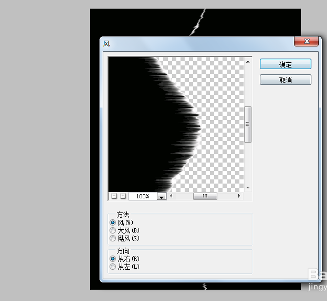6、执行图像-图像旋转-逆时针旋转90度命令,执行滤镜-风格化-风命令,在弹出对话框中设置方法为风,方向从右,点击确定按钮。