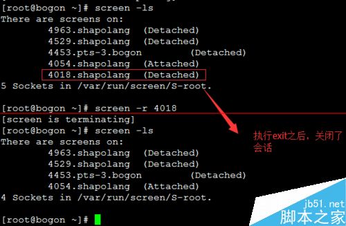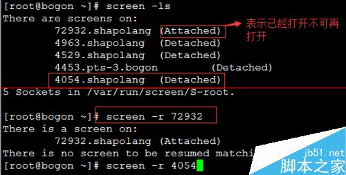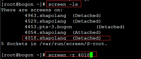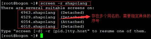 可以通过screen -r 4054.shapolang或者screen -r 4054获取指定会话(建议使用后一种,第一种比较复杂)