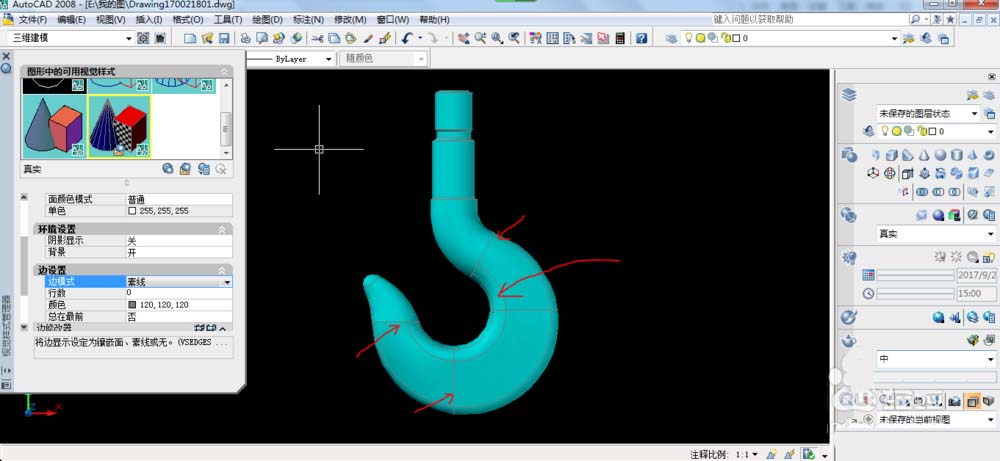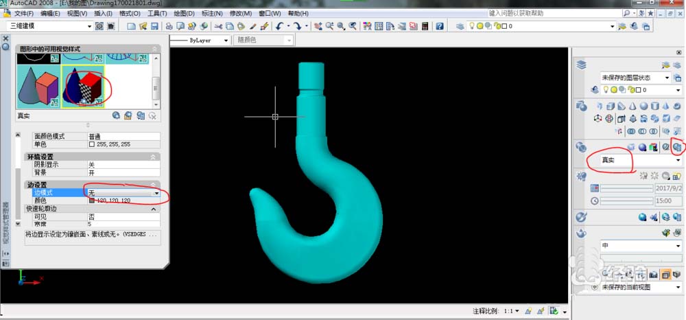 3、点击右侧的“视觉样式管理器”,选择真实视觉样式。这时我们发现“视觉样式管理器”的“边设置”里“边模式”显示“素线”,这是问题的关键