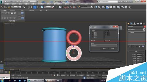3、使用“选择并移动”工具选择圆环,然后按住Shift键在前视图中向下移动复制一个圆环到管状体底部,如图