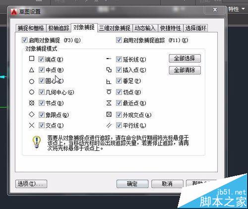 5、这时就要思考了,自动追踪一定与对象捕捉有关,我打开对象捕捉的对话框。有时候画图是经常为了快,经常勾选那个全部选择。