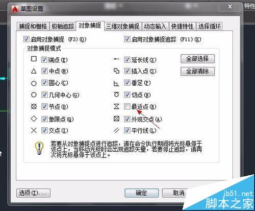 6、其实,问题就处在这里。这样使得箭头在任何位置都被捕捉,最起码要勾去"最近点",才能实现自动追踪功能.