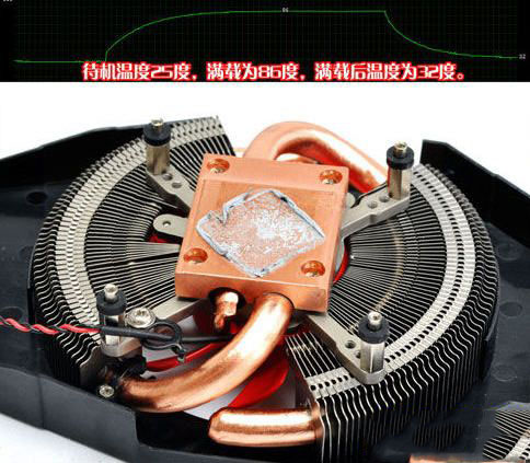 2、双热管+铜底散热器测试结果:待机25度,满载85度