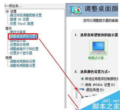 2、在NVIDIA控制面板中点击左侧列表中的“调整桌面颜色设置”然后在右侧就能调节亮度了。