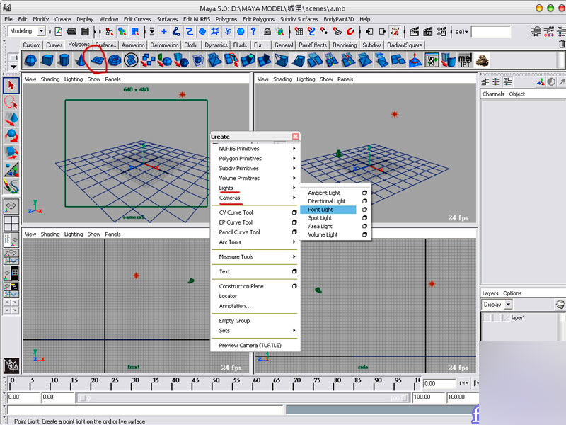 先建立平面(polygon)、light-point light、cameras-camera
