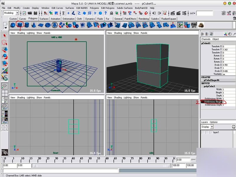 建立一個方塊,並將細分改成3,並拉成長方形