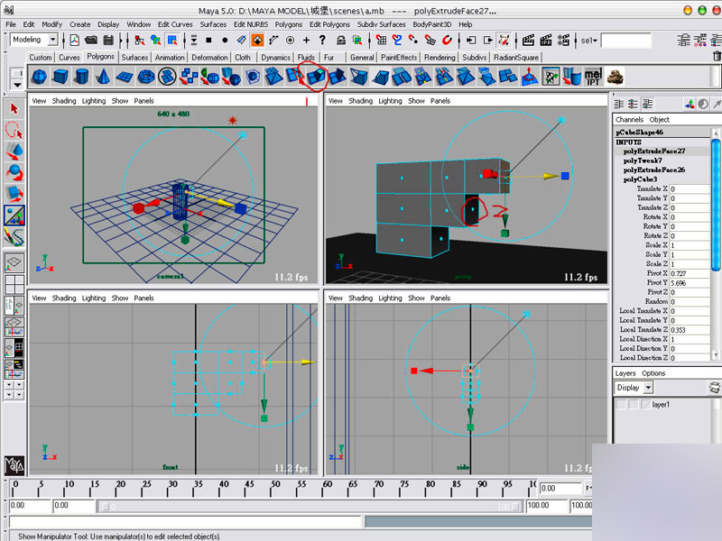 選擇圓柱上的face並網內推,你可隨便選擇圓柱四邊網內推,這是要做窗戶用的,使用到的工具是extrude face,這指令後面會常用到,以後就不說了
