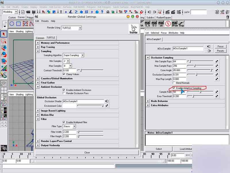 這時先渲染看看效果如何,開啟海龜渲染器並如圖設置,在occlusion shader選擇ilroccsampler1的材質球。