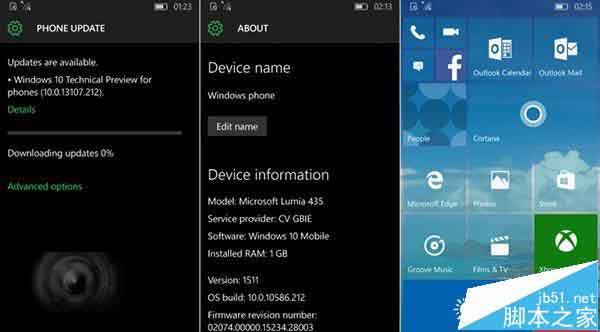 微软本月18日向18款WP8.1老机型推送了Win10 Mobile移动版正式版升级,推送版本号为10586.64。现在更新的版本截图在网络上曝光,版本号为10586.212,包括升级截图以及升级后的系统关于和开始屏幕截图。该版本很可能会是Win10移动版的下一次累积更新。另外,由于Windows10桌面版和移动版版本号已经统一,因此桌面版也有望在近期迎来这一更新。