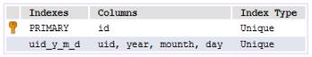 今天在使用TP3.2插入数据的时候,为了避免插入相同的数据(所谓相同的数据,其主键相同或者是唯一索引的字段相同),我创建的索引如下图,主键索引为自增字段,不可能出现重复,即唯一索引可能会出现重复,我希望的是uid,year,mounth,day 这三个字段出现相同的话,就更新当前记录。