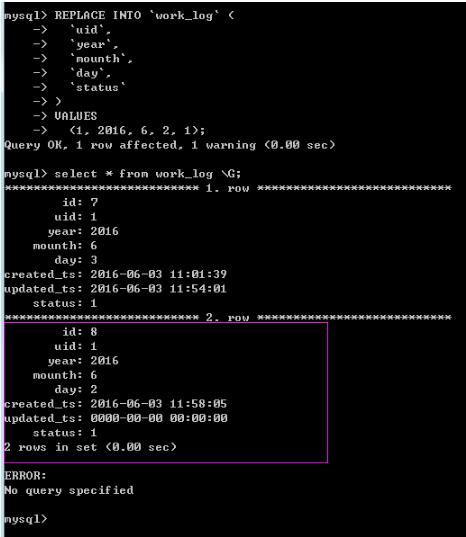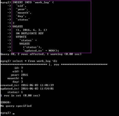 INSERT INTO `work_log` ( `uid`, `year`, `mounth`, `day`, `status` ) VALUES (1, 2016, 6, 3, 1) ON DUPLICATE KEY UPDATE `status` = VALUES (`status`), `updated_ts` = NOW();