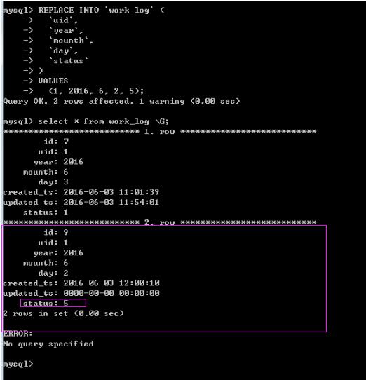 REPLACE INTO `work_log` ( `uid`, `year`, `mounth`, `day`, `status` ) VALUES (1, 2016, 6, 2, 1)