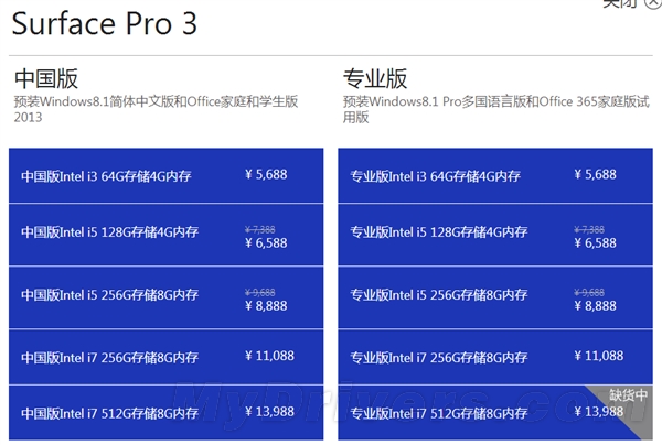 即日起,Surface Pro 3 i5/4GB/128GB版本从7388元降至6588元,i5/8GB/256GB版本从9688元降至8888元,降幅均为800元。
