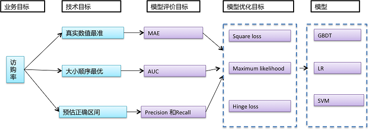 为实际问题选择模型,需要转化问题的业务目标为模型评价目标,转化模型评价目标为模型优化目标;根据业务的不同目标,选择合适的模型,具体关系如下: