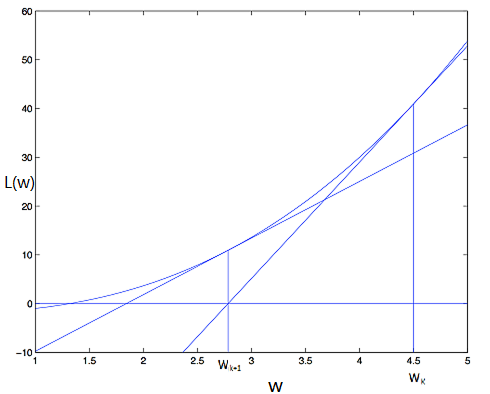 牛顿法的基本思想是在极小点附近通过对目标函数做二阶Taylor展开,进而找到L(w)的极小点的估计值。形象地讲,在wk处做切线,该切线与L(w)=0的交点即为下一个迭代点wk+1(示意图如下)。w的更新公式如下,其中目标函数的二阶偏导数,即为大名鼎鼎的Hessian矩阵。