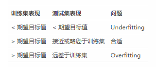 在实战中,可以基于模型在训练集和测试集上的表现来确定当前模型到底是Underfitting还是Overfitting,判断方式如下表: