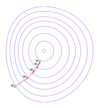 即w沿着损失函数的负梯度方向进行调整,示意图见下图,的梯度即一阶导数(见下式),梯度下降有多种类型,如随机梯度下降或批量梯度下降。